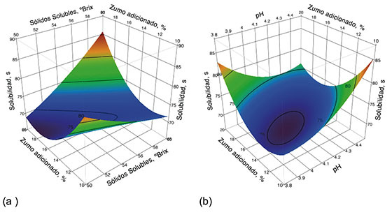 El ANOVA reveló diferencia significativa, a nivel de confianza del 95%, del efecto cuadrático del zumo adicionado (p=0,0169), y de las interacciones pH-zumo adicionado (p=0,0489) y sólidos solubles-zumo adicionado (p=0,0079) sobre la solubilidad. A concentraciones de sólidos solubles de 50 °Brix, la solubilidad se redujo aproximadamente un 17%, cuando el zumo adicionado pasó de 10-20% (Figura 3a), mientras que a concentraciones de 60 °Brix se presentó un aumento de esta propiedad en aproximadamente un 20% (68,9 a 82,69s). Estas tendencias probablemente estén relacionadas con la cantidad de sólidos solubles adicionados (50 a 60 ºBrix). Los valores bajos de solubilidad de los cocristales se pueden atribuir al hecho de que estos son sistemas de aglomerados porosos, en los cuales las soluciones acuosas pueden penetrar fácilmente y liberar el compuesto activo para su disolución (Chen et al., 1988).