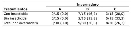 En las plántulas de tomate se encontraron muestras infectadas con el ToCV solamente en los invernaderos B y C. La infección ocurrió en ambos sitios independientemente de la aplicación o no de insecticida a las bandejas. Los porcentajes de infección totales por invernadero y por tratamiento fueron menores a 25%; sin embargo, de forma individual, en algunos invernaderos el porcentaje fue mayor al 30% (Cuadro 1). Cuando se realizó la prueba de Fisher, no se encontraron diferencias significativas (p>0,5) entre los tratamientos.