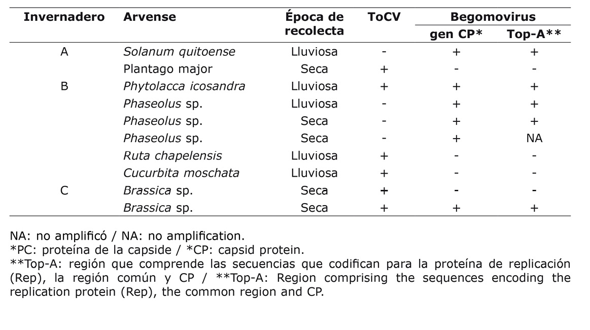 Seis muestras de las 78 arvenses examinadas, estaban infectadas con ToCV, lo que representa un 7,7% del total. En el invernadero A, la especie Plantago major (Plantaginaceae) fue la única positiva. Mientras que en el invernadero B, tres muestras resultaron infectadas, estas correspondieron a Ruta chapelensis (Rutaceae), Phytolacca icosandra (Phytolacaceae) y Cucurbita moschata (Cucurbitaceae), que crecía como planta voluntaria. Para el invernadero C, se identificaron dos plantas del género Brassica (Brassicaceae) positivas para el crinivirus. Además, se identificaron muestras de arvenses positivas para begomovirus con la técnica de hibridación molecular. Estos resultados se confirmaron por medio de RCA y PCR con dos pares de iniciadores degenerados. Excepto por una muestra de Phaseolus sp, todas las muestras amplificaron con ambos iniciadores (Cuadro 2).