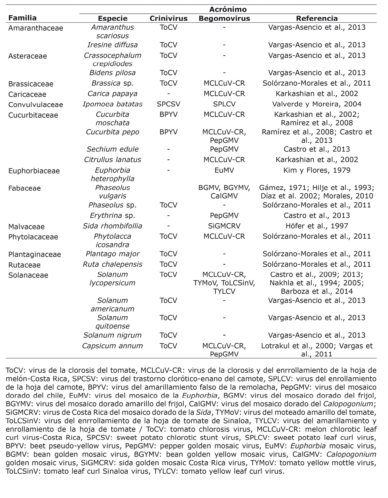 Dos de las seis arvenses positivas para begomovirus, también estaban infectadas con el ToCV (Cuadro 2). En total, se han encontrado catorce especies de plantas distribuidas en nueve familias, susceptibles a infecciones del ToCV en Costa Rica; convirtiéndolo en el crinivirus con mayor amplitud de hospedantes del país (Cuadro 3).