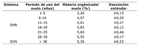 En el Cuadro 1 se presenta el contenido de materia orgánica del suelo a la profundidad de 0 a 20 cm, por periodo de uso del suelo, para los sistemas de mango con riego (SMR) y vegetación de bosque natural (SVN), considerado al final, puesto que el contenido de materia orgánica del SMR podía tender en el tiempo al del SVN. La materia orgánica mostró un incremento a partir del periodo de 1 a 5 años, previo al cual existió maíz de temporal y hortalizas con riego, hasta el periodo de 16 a 30 años, en el cual se habría alcanzado un equilibrio de ella en el suelo hasta alcanzar el nivel del SVN. Esto indicó que la materia orgánica del suelo en el SMR alcanzó valores máximos y similares del SVN, entre los 16 y los 20 años.