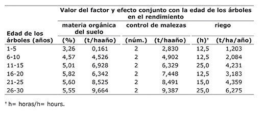 El efecto conjunto de la edad de los árboles y la materia orgánica del suelo, sobre el rendimiento de mango entre los períodos de uso del suelo de 1 a 5 años y de 26 a 30 años fue de 9,5 t/ha/año. Por otra parte, el efecto conjunto de la edad de los árboles con los demás factores que quedaron incluidos en el modelo de regresión sobre el rendimiento de mango fue de 6,6 t ha/año para el control de malezas (dos controles) y de 4,1 t ha/año para el tiempo de riego (25 h en comparación con 12,5 h) (Cuadro 2).