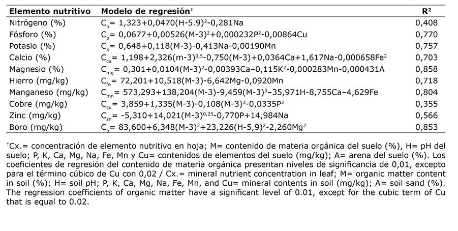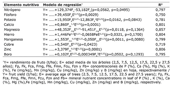 Table 3. Regression models for yield of mango trees as function of nutrient leaf content and soil properties. Campeche, México. 1974-2003.