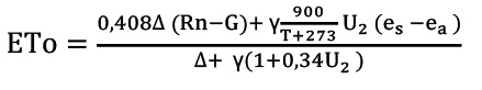 Donde: ETo es la evapotranspiración de referencia (mm/día); Rn es la radiación neta en la superficie del cultivo (MJ/m2/día); G es el flujo de calor del suelo (MJ/m2/día); T es la temperatura media del aire a 2 m de altura; U2 es la velocidad del viento de día a 2 m de altura (m/s); g es la constante psicométrica modificada utilizada en el método de Penman-Monteith (mbar/°C); (es – ea) es el déficit de presión de vapor (kPa); es es la presión de vapor a saturación de la temperatura promedio del aire (kPa); ea es la presión de vapor tomada a la temperatura a punto de rocío (kPa); D es la pendiente de la curva de presión de la saturación de vapor a una temperatura específica (kPa/ºC); g es la constante psicométrica modificada utilizada en el método de Penman-Monteith (kPa/°C).