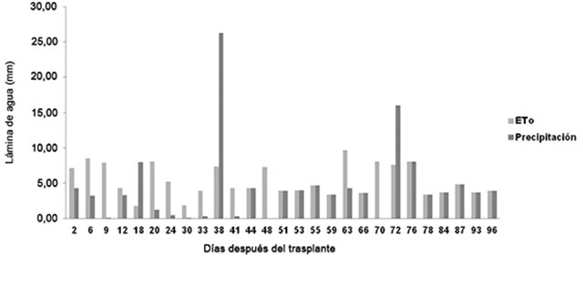 La precipitación promedio diaria registrada estuvo entre 0 mm y 26,3 mm, así como la ETo entre 1,8 mm y 9,7 mm (Figura 1).