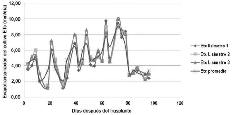 Los valores de ETc obtenidos para los tres lisímetros siguieron una distribución normal (P=0,146), cumplieron con la homogeneidad de varianzas (p= 0,997) y no presentaron diferencias entre sus medias (P=0,811), siguiendo tendencias similares (Figura 2). Los coeficientes de correlación de Sperman entre lisímetros hallados (P<0,01) estuvieron entre 0,92 y 0,96. Los valores resgistrados de ETc estuvieron entre 1,16 mm/día alcanzado a los 30 ddt en el lisímetro 1 y 9,00 mm/día a los 63 ddt en el lisímetro 2.