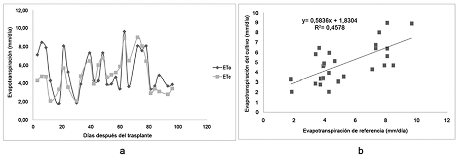 El comportamiento de la ETc y de la ETo presentaron tendencias similares (Figura 3a). El valor mínimo y máximo de ETo fueron 1,79 y 9,67 mm, presentados a los 18 y 63 ddt, respectivamente; mientras que los de ETc estuvieron entre 2,08 y 9,01, a los 12 y 72 ddt, respectivamente. Entre los 3 y los 12 ddt, la ETo estuvo entre 30% y 51% por encima de la ETc. Finalizando la etapa fenológica de crecimiento y desarrollo, y durante la etapa de madurez la ETc sobrepasó a la ETo entre 7 y 28%.