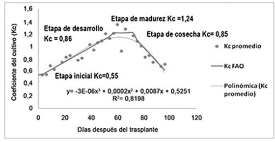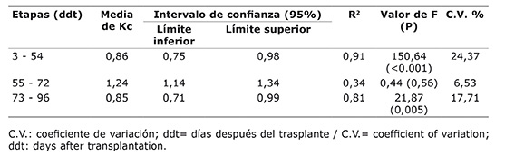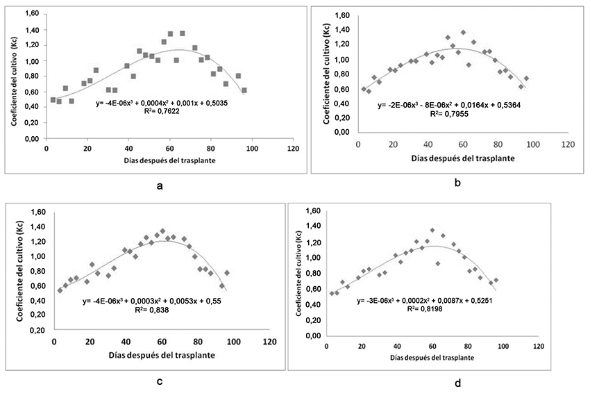 El comportamiento del Kc en el tiempo siguió modelos polinomiales de segundo orden, cuyos coeficientes de regresión no lineal fueron altamente significativos (P≤0,001), y estuvieron entre 0,67 y 0,80 (Figura 4). Los valores de Kc hallados variaron entre 0,48 y 1,35 para el lisímetro 1, entre 0,57 y 1,37 para el lisímetro 2 y entre 0,54 y 1,35 para el lisímetro 3. En promedio, los Kc variaron entre 0,55 y 1,36, donde los mayores valores se presentaron en la etapa de madurez. Los resultados obtenidos estuvieron por debajo de los reportados por otros autores, cuyos valores hallados estuvieron entre 1,16 y 1,45 (Fronza y Folegatti, 2003) y entre 0,85 y 1,14 en condiciones mediterráneas (Lavini et al., 2008). No obstante, fueron más altos que los reportados por González et al. (2002) en Paraguay, en cultivos sembrados sobre 3 cm de mulch de bagazo de caña, cuyos valores estuvieron entre 0,25 y 0,82. Se encontraron valores entre 0,36 y 0,59 en cultivos de estevia sembrada en condiciones parcialmente protegidas, donde las etapas del cultivo establecidas fueron más cortas que las halladas en el presente trabajo, situación que pudo deberse a diferencias en condiciones climáticas (Villafañe et al., 2016).