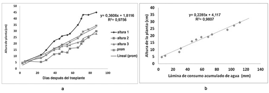 Figure 6. (a) Variation in height throughout the cycle of estevia (F = 519.48, p<0.001) and (b) relationship between plant height and water consumption by estevia (F= 669.35; p<0.001). Experiment performed in Candelaria, The Cauca Valley, Colombia. From February to June, 2015.