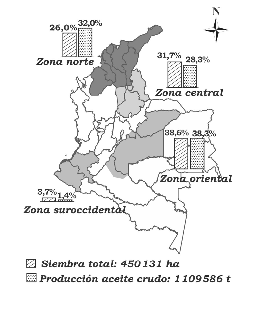 La palma africana o aceitera es originaria de las costas del golfo de Guinea en África Occidental, fue introducida en el continente americano en el siglo XVI, y más tarde, en 1945, en el departamento de Magdalena por la United Fruit Company (Aguilera-Díaz, 2002). En la actualidad existen cerca de 450 131 ha cultivadas, ubicando a Colombia en el quinto puesto a nivel global con menos del 2%, tanto en producción como en superficie cultivada; mientras que países como Malasia, Indonesia, Tailandia y Nigeria, concentran el 81,7% de la producción y alrededor del 80% de la superficie mundial (Yusoff, 2006; Sumathi et al., 2008; Shuit et al., 2009). En Colombia, las plantaciones de palma se encuentran ubicadas en cuatro zonas; la oriental, la central y la norte, son las que poseen la mayor producción de aceite y área sembrada, respectivamente (Figura 1). Gran parte de la producción de aceite del país proviene de los municipios productores de la región Caribe, la cual representó cerca del 32% de la producción total para el año 2013 (González et al., 2015). En estos lugares, igualmente se concentran las mayores posibilidades de beneficio de los subproductos de la palma.