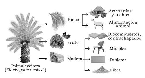 Al igual que todas las plantas, la palma aceitera almacena parte de la energía producida en la fotosíntesis en forma de materia orgánica, la cual está conformada por material vegetal como las hojas, el tronco, racimos vacíos, material fibroso y otros residuos de la industrialización del aceite (Sumathi et al., 2008). Alrededor de 1,1 t de fibras generadas por cada tonelada de aceite producido, podrían ser utilizadas como materia prima para productos industriales y artesanales, en la fabricación de biocompuestos naturales, lo cual reduce la utilización de polímeros (Shinoj et al., 2011), obteniendo así mayor degradabilidad, menor toxicidad (Rozman et al., 2003), mejores propiedades mecánicas, resistencia térmica y al paso del agua (Sreekala et al., 2004), así como productos útiles en la industria de plastificantes y de accesorios para automóviles (Shuit et al., 2009).