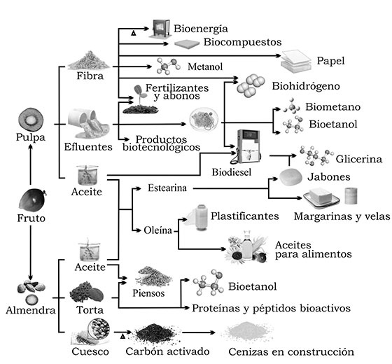 Figure 3. Alternatives for comprehensive use of industrial and biotechnological products and byproducts, that can be produced from oil palm fruit