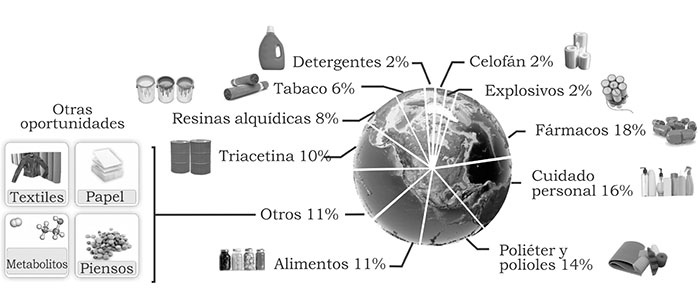 Fuente: recopilación de Prasertsan y Prasertsan (1996); Ma y Hanna (1999); Lin y Lay (2004); Morimoto et al. (2004); Atif et al. (2005); Mohamed et al. (2005); Yacob et al. (2006); Yusoff (2006); Yazdani y Gonzalez (2007); O-Thong et al. (2008); Reyes y Ortíz (2008); Sumathi et al. (2008); Khan et al. (2009); Rincón y Martínez (2009); Shuit et al. (2009); Wu et al. (2009); Yaakub et al. (2009); Kok et al. (2011); Lam y Lee (2011); Razuan et al. (2011); Chee et al. (2012); Suhaily et al. (2012); Alengaram et al. (2013); Ng et al. (2013); Tan et al. (2013).Figure 4. Percentage worldwide distribution of the glycerol market and its industrial uses.