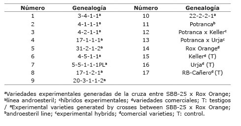 Los experimentos se establecieron en ensayos uniformes con diecisiete genotipos, en un diseño de bloques completos al azar y tres repeticiones. Los genotipos fueron: diez variedades experimentales originadas de la cruza de SBB-25 x Rox Orange, Potranca (línea androesteril), dos híbridos experimentales producto de la cruza de Potranca con Keller y Urja (Cuadro 1), y cuatro variedades comerciales: Rox Orange y Keller (USA); Urja (India) y RB-Cañero (México). Incluyendo dentro de estas a los testigos (T); Keller, Urja y RB-Cañero.