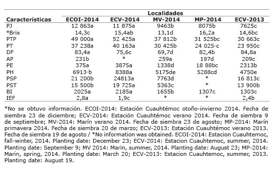 En la Estación Cuauhtémoc se obtuvo los °Brix del jugo, midiendo y promediando cinco plantas por parcela en el entrenudo medio de la planta, con el mismo tipo de refractómetro. En las localidades de la Estación Cuauhtémoc, el peso de jugo (PJ) se estimó con la siguiente fórmula: PJ = PT x % J/100. El % de jugo (% J) por genotipo se obtuvo en Marín multiplicando el PJ x 100 y dividiéndolo entre PT. Para todas la características evaluadas, los valores obtenidos de peso en gramos se transformaron a kg/ha. La producción de bioetanol (l/ha), se estimó multiplicando el peso fresco de tallo en kg/ha por 0,0544, de acuerdo con lo reportado por Almodares y Hadi (2009). La incidencia de enfermedades foliares (IEF) se evaluó en las localidades de Estación Cuauhtémoc, y el acame (A) en Marín verano 2014. La primera característica se calificó en forma visual, mediante una escala de 1 al 5, donde: 1 es sin daño, 2 de 1 a 10% de daño, 3 de 11 a 25% de daño; 4 de 26 a 40% de daño y 5 más de 41%. Para acame: 1 es 10% de plantas acamadas, 2 es de 10 a 25% de plantas acamadas, 3 de 25-50%, 4 de 50-75% y 5 de 75-100%. Esto en concordancia con las indicaciones descritas por House (1985). Se utilizó la información meteorológica (precipitacion, temperatura, etc.), que se obtuvo de las estaciones ubicadas en Marín, Nuevo león y Estación Cuauhtémoc, Tamaulipas.
