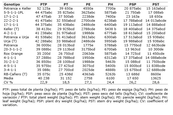 Potranca x Keller y la variedad 17-1-2-1 (Cuadro 3), presentaron el mayor PH con 7700 y 7400 (kg/ha), respectivamente. Asimismo, estos dos materiales presentaron valores superiores en PH, PSP y PST que RB-Cañero, y esta última variedad fue la que presentó los valores más bajos.
