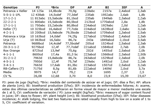 Potranca x Keller (Cuadro 4), presentó 37% mayor producción (14 125 kg/ha) de PJ que Keller (10 325 kg/ha). En contenido de azúcar en el jugo en °Brix (14,8), fue igual que los testigos (16,4 a 16,5), excepto a RB-Cañero (8,5 °Brix), el cual presentó el valor más bajo. Algunos materiales presentaron valores inferiores en PJ (7950 a 9275) y °Brix (12,4), como las variedades experimentales 20-3-1-1-2 y 4-5-1-1. Por otra parte, en PJ y °Brix las variedades 5-5-1-1-1PL (12 438 y 14,5), 17-1-2-1 (11 813 y 15,5), 22-2-2-1 (11 800 y 15,5) y 17-1-1-1 (11 750 y 15,2) fueron iguales a Potranca x Keller (14 125 y 14,8), Potranca x Urja (10 163 y 14), Keller (10 325 y 16,4) y Urja (10 063 y 16,5).