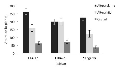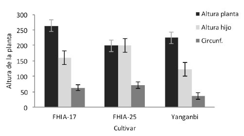 La mayor altura del hijo en el cultivar FHIA-17 (Figura 1), se registró con un valor de 161 cm, resultado que no concuerda con el dato de 252 cm reportado por Deras (2012); las diferencias se pueden atribuir al manejo de datos de un segundo ciclo de producción, condiciones diferentes de densidad o suelos.