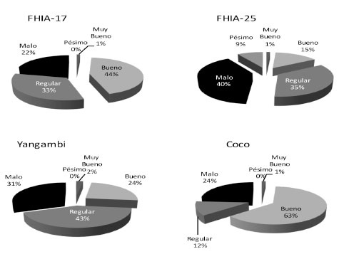 Uno de los factores que resultan imprescindibles de analizar es la percepción del sabor por parte de los consumidores y para tal fin se realizó una degustación con veinticinco individuos, entre ellos una parte fueron de los productores que tenían una de las parcelas en su finca y otros técnicos relacionados con el cultivo, se obtuvieron resultados sobre cada uno de ellos por separado, como se puede apreciar en la Figura 10, el Coco fue el que presentó “bueno” en mayor proporción (63%), seguido por el FHIA-17 con un 44%, mientras que apenas un 15% de los participantes en la prueba lo encontró el FHIA-25 como “bueno”, más bien un 9% consideró su sabor como “pésimo”, consecuentemente no mostró una aceptación de fruta como postre. Por su parte, el Yangambi, apenas presentó un porcentaje de aceptación como “bueno” de 24, pero podría tener potencial, ya que un 44% de los entrevistados opinó que su sabor era regular.
