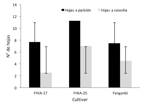 La mayor cantidad de hojas funcionales por planta, tanto al momento de la parición, así como en la cosecha, se presentó en el cultivar FHIA-25 (Figura 3), con valores promedio de 11 y 7, respectivamente. En investigaciones realizadas en La Fe, Honduras, se obtuvieron valores de quince hojas a parición (Deras, 2012), similar a lo reportado por Sevilla (2010), siendo el FHIA-25 el que mayor número de hojas presentó. Le siguió el cultivar FHIA-17 con 7,7 a parición y 2,5 al momento de la cosecha, de forma similar se comportó el Yangambi, pero con más hojas al momento de la cosecha (4,5). La cantidad de hojas de la variedad FHIA-17 puede variar de 6 hasta 12,5 hojas, después de cuatro meses puede llegar a tener solo entre 5,4 y 1,8 hojas, esto por presentar una mayor susceptibilidad a la Sigatoka negra.