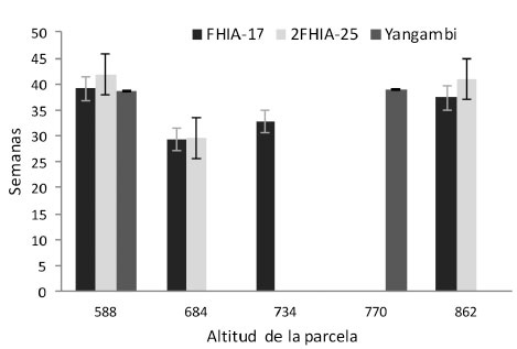 El Yangambi se cosechó a las 44,67 semanas, aunque este cultivar tardó más en llegar a parición, la fruta permaneció solo 3,17 semanas colgando, mientras que la fruta del FHIA-17 6,35 semanas, demostrando la precocidad del Yangambi para llegar al momento de cosecha. El FHIA-17 en la parcela ubicada a 588 msnm, inició la parición casi a las 39,05 semanas (273,35 días), disminuyendo los días a parición según lo mencionado por Coto y Aguilar (2004), quienes establecieron un periodo de 315 días.