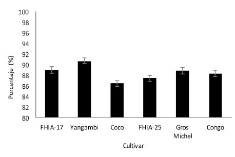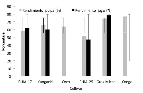 En cuanto al porcentaje de rendimiento de pulpa (Figura 9) de todos los cultivares analizados, se encontró que los mayores porcentajes se presentaron en los cultivares Congo y el Gros Michel con valores de 78 y 74% respectivamente, y los demás con valores de 63% o menos, y por último, el FHIA-25 con un 50% de extracción de pulpa, valor que fue más del doble de lo reportado por Self (2000). Estos valores son importantes si se relacionan con la producción de almidón de banano, que en el caso de FHIA-25 se reportan valores de 23,8 como porcentaje de peso seco. Para el caso del Congo no se pudo analizar por problemas con la muestra.