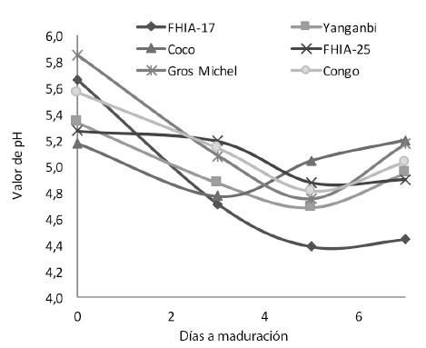 El nivel de acidez (Figura 6) mostró cómo el cultivar FHIA-17 fue el que más bajó su nivel de pH conforme maduró la fruta y se podría asociar con la no aceptación por parte de los consumidores al probar esta fruta en estado maduro, según comentarios de productores que tenían una parcela en su finca, es el que se suponía que sería más atractivo por parte de los consumidores por su parecido al Gros Michel (Staver, comunicación personal, 2013), que se presentó del Coco o Gros Michel (5,2), materiales más apetecidos por los consumidores de esta fruta como postre.