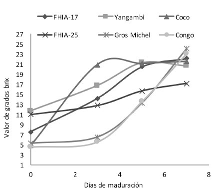 Figure 7. Number of soluble solids, expressed in brix degrees, found during the ripening process of six banana cultivars that have potential commercial use and with actual commercial use. Turrialba, Costa Rica, 2013-2014.