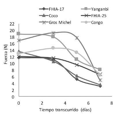La firmeza podría ser utilizada como un índice de madurez o maduración (Dazie y Orchard, s.f.); también para facilitar la comparación de la tasa de ablandamiento de los nuevos híbridos con la de sus progenitores. La estimación de la firmeza es importante en la evaluación de la susceptibilidad de la fruta a daños físicos o mecánicos o manejo poscosecha (Piña et al., 2006). La firmeza medida en los frutos obedece al valor de la fuerza máxima necesaria para que la pulpa ceda a la punta de la sonda, generalmente se registra en kilogramo-fuerza (kgf) o Newton (N) (1 kgf = 9.80665 N). Con respecto a la evaluación, se pudo observar en la Figura 8 que todos los materiales presentaron valores de 10 hasta 20 N al inicio del proceso de maduración y descendió hasta niveles de 2 en FHIA-17 a 10 N en el cultivar Yangambi (Figura 8), característica que estaría íntimamente relacionada con el adecuado manejo poscosecha de cada uno de los cultivares, ya sea de consumo como postre, industria o cocción.