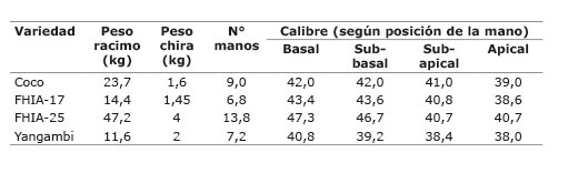 El segundo mayor peso de fruta fue del cultivar Coco (Cuadro 1), que es uno de los más apetecidos como fruta fresca por los consumidores, pero tiene la limitante que es altamente susceptible al mal de Panamá (Ramírez, 2010). En cuanto al número de manos, el FHIA 25 presentó la mayor cantidad de manos aprovechables. El segundo lugar lo ocupó la variedad Coco, con una fruta de gran vigor, debido a que presentó en promedio 9,0 manos aprovechables, seguido por el cultivar FHIA-17, el Congo y por último, el Yangambi con 7,2.