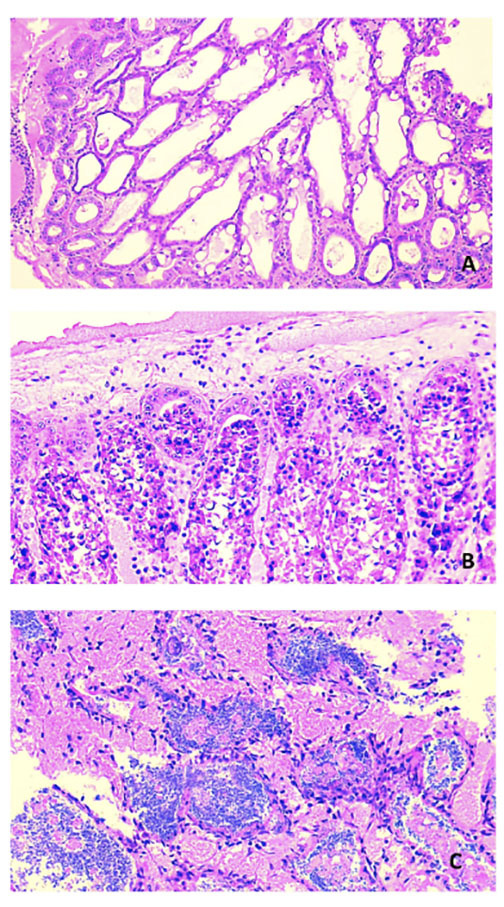 Figure 1. Juvenile Penaeus vannamei, showing the typical clinical acute hepatopancreatic necrosis disease (AHPND) signology. A) Acute phase of infection, cell detachment is observed advancing from the basal region of the tubule, the apical region remains without showing detachment, but there is a decrease in mitotic activity. B) Phase transition, it is possible to start observing bacteria, as well as secondary infections, also edematous areas are observed, in addition to the aforementioned, cell detachments continue. C) Phase terminal, massive bacterial infection is evident, necrotic tubules and generalized haemocyte infiltrations are observed.