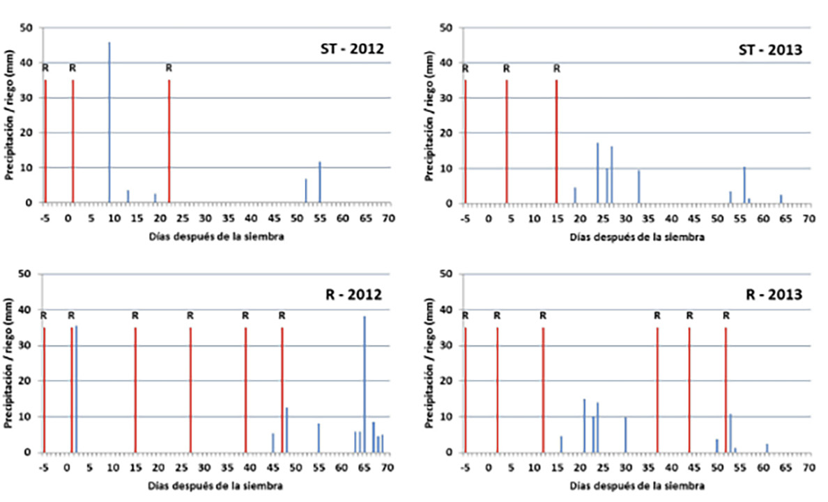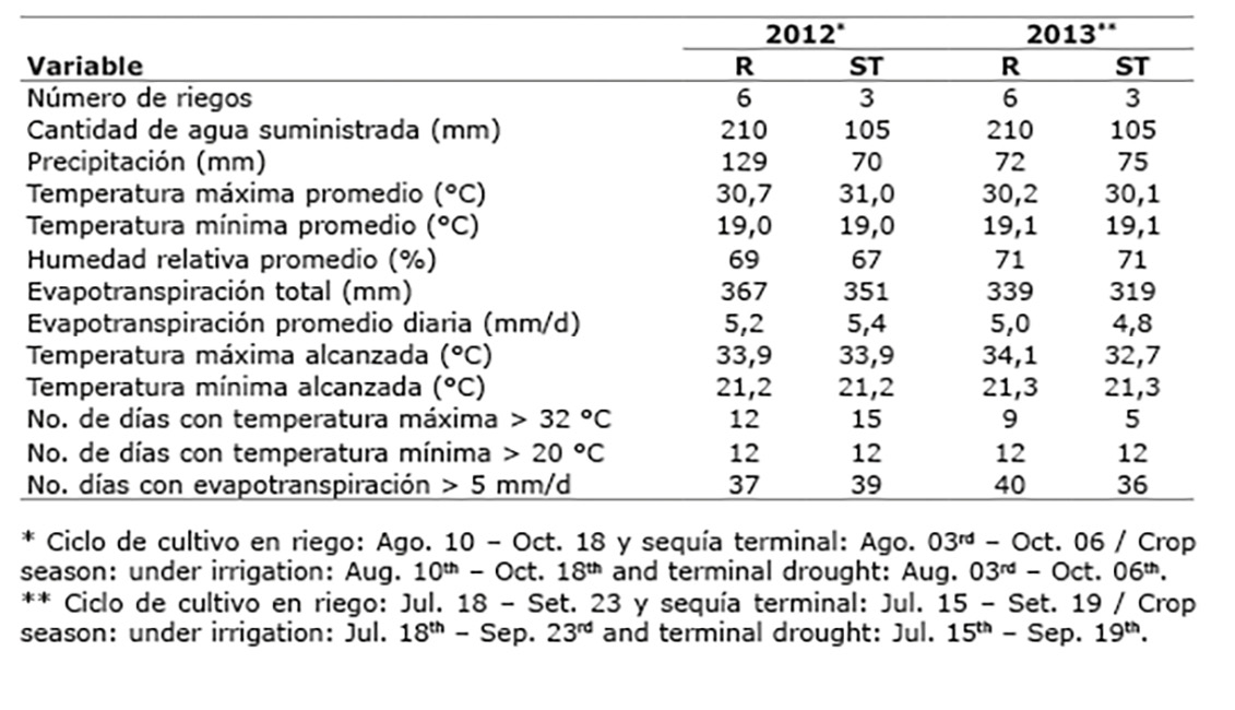 Las condiciones climáticas prevalecientes para el ambiente de riego y de sequía terminal fueron similares en los dos años de estudio (Cuadro 2); con escasa precipitación (entre 70 y 129 mm) y, entre 36 y 40 días con alta evapotranspiración (>5 mm/d). La distribución de las lluvias y manejo del riego durante el ciclo de cultivo (Figura 1), indicaron que una vez alcanzada la etapa de floración, 30 dds en las líneas más precoces, se tuvo una condición de sequía terminal en el ambiente con estrés. Al respecto, el impacto de la sequía terminal experimentada durante la realización del ensayo, medido a través del IIS, fue similar en los dos años de estudio, 0,66 en el 2012 y 0,70 en el 2013.