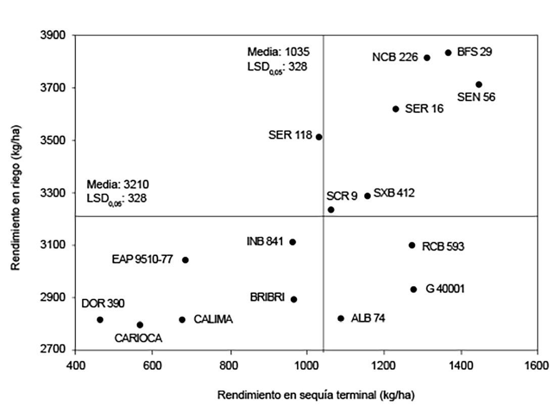 La llegada de un período de sequía dentro del ciclo de cultivo es incierta, por lo que, no se puede prevenir. Debido a esta razón, es importante enfocar el mejoramiento del cultivo por resistencia a sequía hacia genotipos que tengan rendimientos altos, tanto en una condición de estrés como cuando no la haya. Bajo este precepto, BFS 29, NCB 226, SEN 56 y SER 16 fueron las mejores líneas (Figura 2), con excelentes rendimientos en ambos ambientes y que podrían representar una solución para las zonas propensas a sufrir sequía terminal. Estos genotipos obtuvieron al menos un 15 y 50% más de rendimiento en riego y sequía terminal, respectivamente, que el testigo comercial EAP 9510-77. BFS 29, NCB 226 y SEN 56, también superaron en rendimiento en ambas condiciones a otros testigos como DOR 390 y Bribrí. Otros genotipos que mostraron rendimientos por encima de EAP 9510-77 en sequía terminal fueron ALB 74 y RCB 593.