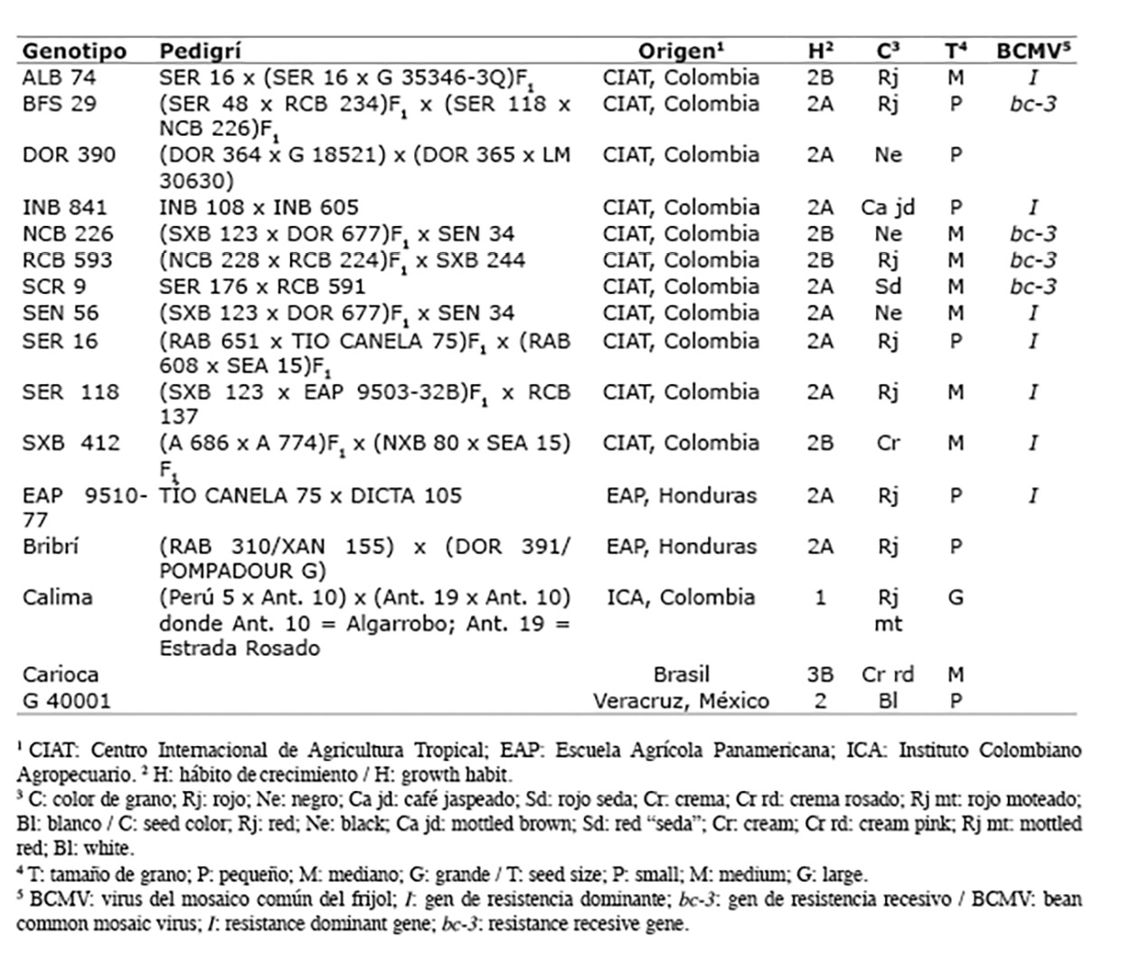 Los genotipos evaluados pertenecen al acervo genético mesoamericano, excepto Calima (andino) y la accesión G 40001 (P. acutifolius). Incluyen líneas élites y avanzadas para sequía, bajo fósforo, resistencia a aluminio, y los testigos comerciales DOR 390, Bribrí, EAP 9510-77, Calima y Carioca (G 4017) (Cuadro 1). DOR 390 fue liberada como la variedad “Negro Tacaná” en México en 1994, “ICTA Costeña” en Guatemala en 1995, “Tomeguín 93” en Cuba en 1996, e “INTA Nueva Guinea” en Nicaragua en 2002 (Rosas et al., 2004a). Bribrí es una de las mejores variedades rojas en Costa Rica y fue el cultivar con mayor área sembrada en el 2004 (Hernández et al., 2001; Rosas et al., 2003; Hernández y Elizondo, 2006); mientras que EAP 9510-77 es una de las variedades rojas comerciales más sembradas en Centroamérica y conocida como Amadeus 77 en Honduras, Cabécar en Costa Rica, CENTA San Andrés en El Salvador e INTA Rojo en Nicaragua (Rosas et al., 2004a; 2004b). Calima es una variedad que fue desarrollada y liberada en 1966 por el Instituto Agropecuario Colombiano (ICA), muy popular en Colombia y utilizada en Panamá, Mozambique, Tanzania y Burundi (Voysest, 2000). Carioca es una variedad brasileña del Instituto Agronómico de Campinas de São Paulo, recibida en 1966 desde Palmital, São Paulo y vigente hasta la fecha. Su origen se desconoce, aunque se especula que pudo provenir de México, donde hay materiales muy parecidos a este (Voysest, 2000).