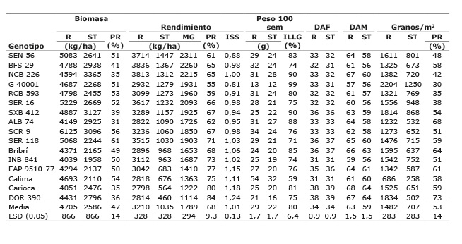 Los parámetros fisiológicos evaluados presentaron diferencias altamente significativas entre las medias de cada ambiente, excepto para la eficiencia del fotosistema II. Al comparar el ambiente de R con ST, la media general del contenido de clorofila pasó de 41 a 46 unidades SPAD (LSD0,001=1,4), la conductancia estomática disminuyó de 513 a 267 mmol/m2/s (LSD0,001=55), la depresión de temperatura del dosel bajó de 7,2 a 3,0°C (LSD0,001=2,2) y el índice de área foliar de 4,00 a 1,95 (LSD0,001=0,43). Además, la conductancia estomática (r=0,30; p≤0,01), la depresión de temperatura del dosel (r=0,28; p≤0,01) y el índice de área foliar (r=0,26; p≤0,01) correlacionaron de forma positiva, pero débil, con el rendimiento en sequía terminal.