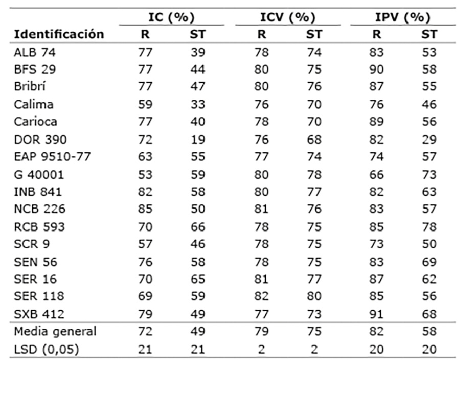 El índice de intensidad de sequía (IIS), indica el grado de estrés al que fueron sometidos los genotipos y la idoneidad de las condiciones que se tuvieron en este estudio para la identificación de materiales con resistencia a sequía terminal. Tanto en el 2012 como en el 2013 se obtuvieron IIS superiores a 0,50, que se consideran altos y pueden ocasionar reducciones del 20-100% en la producción de biomasa, el rendimiento y sus distintos parámetros en frijol común (Muñoz-Perea et al., 2007). Los valores de IIS obtenidos fueron similares a los de otros estudios realizados en CIAT, de 0,57 a 0,67 (Terán y Singh, 2002b) y a los de investigaciones llevadas a cabo en otros países con condiciones tropicales, como Puerto Rico, de 0,50 a 0,64 (Porch et al., 2009). De acuerdo con los valores de IIS obtenidos, se tuvieron condiciones óptimas para la identificación de genotipos con mayor resistencia a sequía terminal.