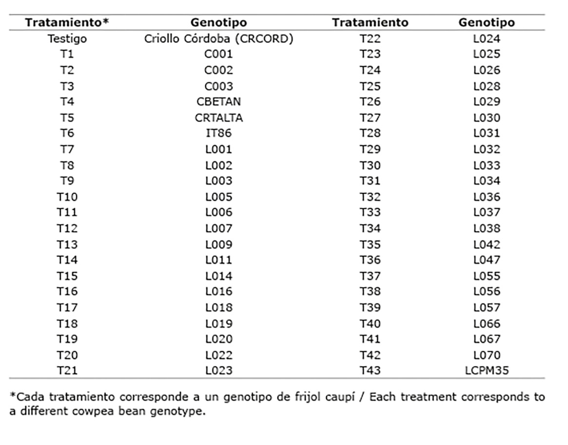Las muestras fueron obtenidas de 43 genotipos de frijol caupí (Vigna unguiculata (L.) Walp) provenientes del Programa de Mejoramiento Genético de la Universidad de Córdoba y un testigo usado por los agricultores del departamento de Córdoba (Cuadro 1).