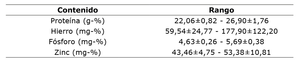 En el Cuadro 2, se muestran los rangos del contenido de proteína, hierro, fosforo y zinc. Los genotipos de mayores contenidos de proteína fueron LCPM35, L042, L047, L026, L029, L019 y L002, con 26,90%±1,76, 26,76%±1,64, 26,76%±1,07, 26,48%±0,97, 26,47%±1,74, 26,32%±0,83 y 26,23%±2,05, respectivamente. El testigo (CRCORD) arrojó un valor menor con 24,68%±1,16.