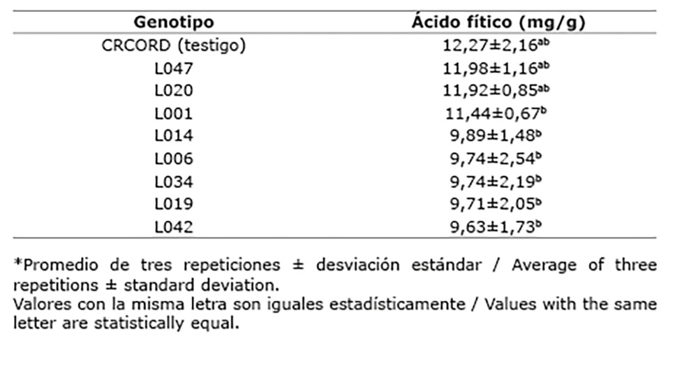 Los genotipos seleccionados por presentar mayores índices de selección (Ecu. 1), fueron CRCORD (testigo), L047, L020, L001, L041, L006, L034, L019 y L042; de los cuales el de mayor contenido de ácido fítico fue CRCORD (12,267±2,158 mg/g) y el de menor fue L042 (9,630±1,725 mg/g) (Cuadro 3).
