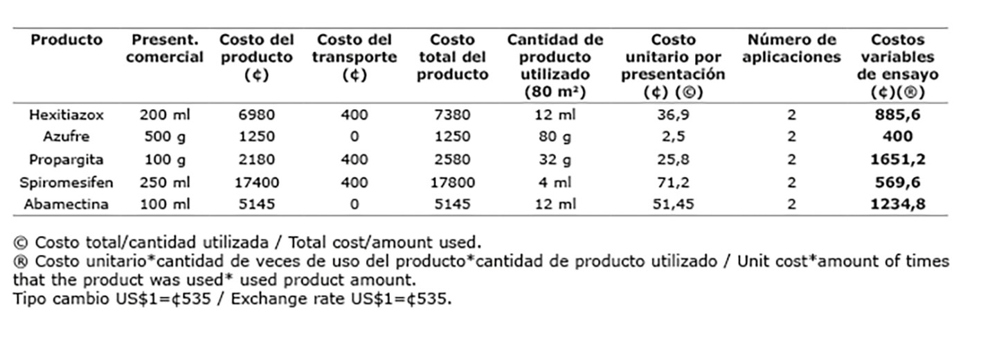 Dentro de los costos relevantes (1) del ensayo, solo se tomaron en cuenta los valores de cada producto utilizado; debido a que las demás variables (mano de obra, costo de maquinaria, costo del agua de la aplicación) no fueron un costo que influenciara directamente el experimento. El costo de transporte se tomó en cuenta dada la distancia y el lugar de donde se debió traer cada insumo. Dentro de los costos que varían en el experimento (3), el producto con el mayor costo del ensayo fue la propargita, seguida de la abamectina y el hexitiazox, mientras que el azufre presentó el menor costo (Cuadro 1).