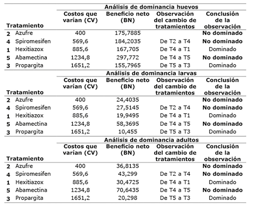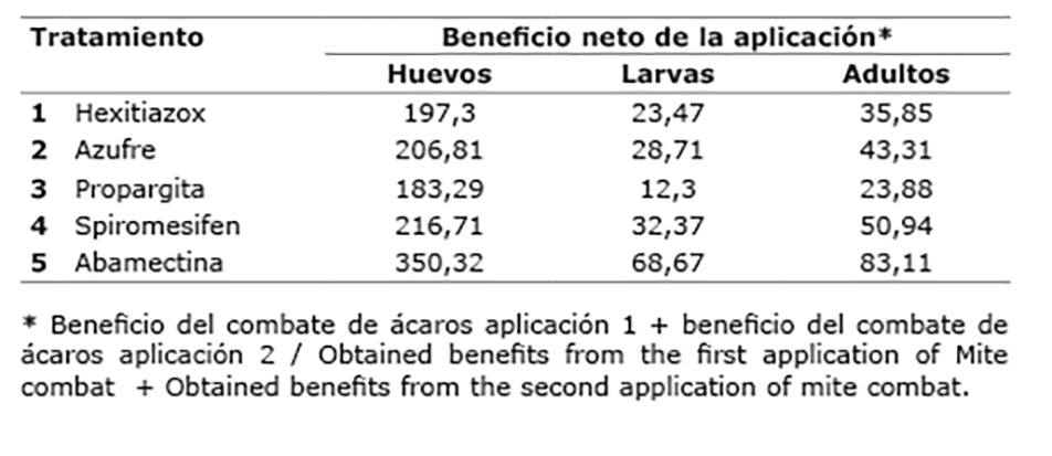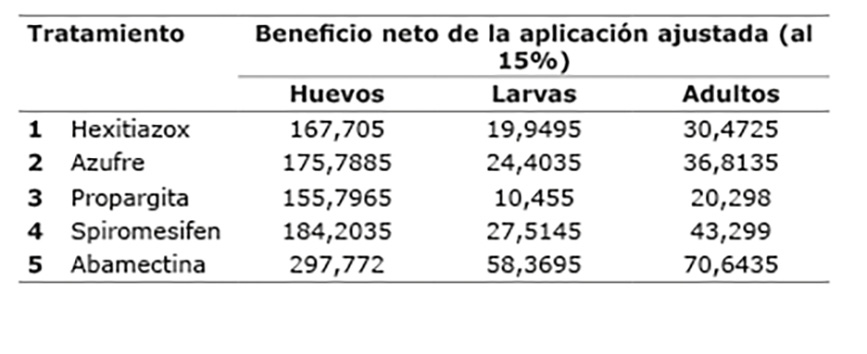 Estimación del beneficio económico neto de las aplicaciones: la estimación del beneficio se obtuvo a partir de la efectividad del combate que presentaron los diferentes productos empleados en los tratamientos. Ello se efectuó al medir las poblaciones del ácaro antes de realizar las aplicaciones y al final de estas. Se tomó de referencia las poblaciones iniciales de los diferentes estadios de los ácaros, contra el promedio de control de cada uno de los diferentes productos en las dos aplicaciones que se realizaron.