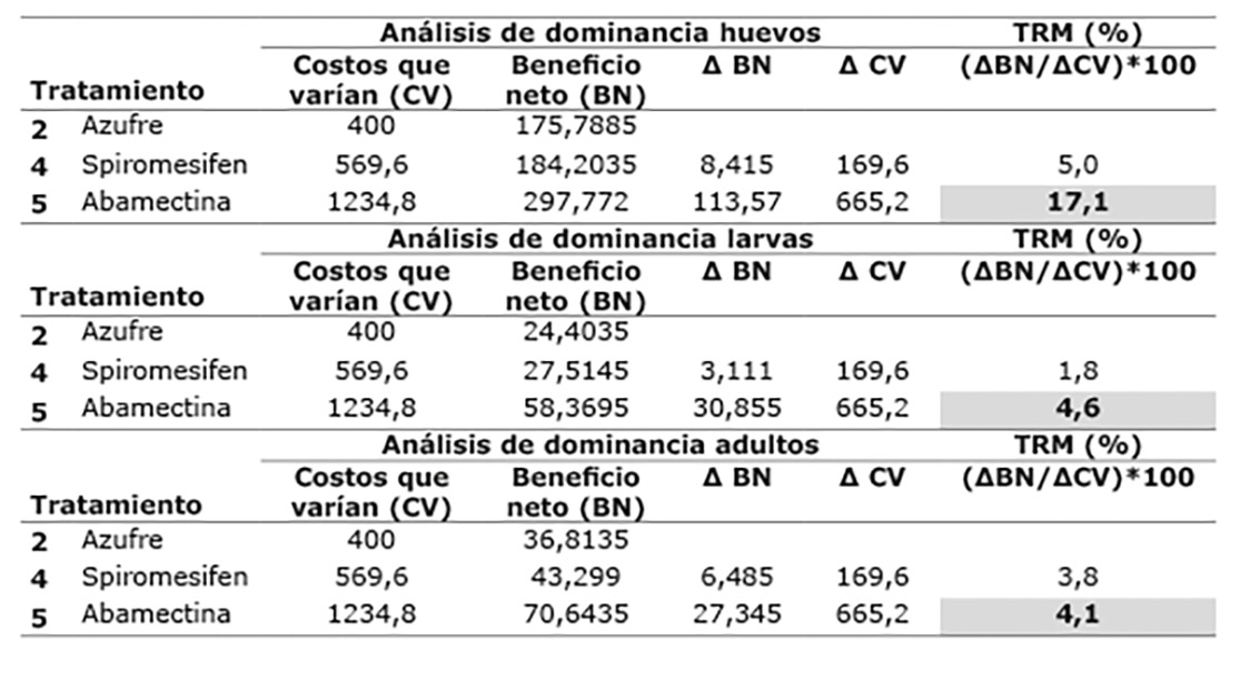El producto con el menor costo (azufre) no se comportó como el tratamiento con el mayor beneficio (abamectina), según la TRM del análisis. Al momento de realizar una evaluación de productos se debe considerar no solo su control en campo, sino observar su costo en relación con el beneficio que puede generar. La metodología de presupuestos parciales proporcionó un abordaje apropiado en virtud de los objetivos y metas que se pretendían alcanzar, porque el experimento ejecutado fue analizado también agronómicamente.