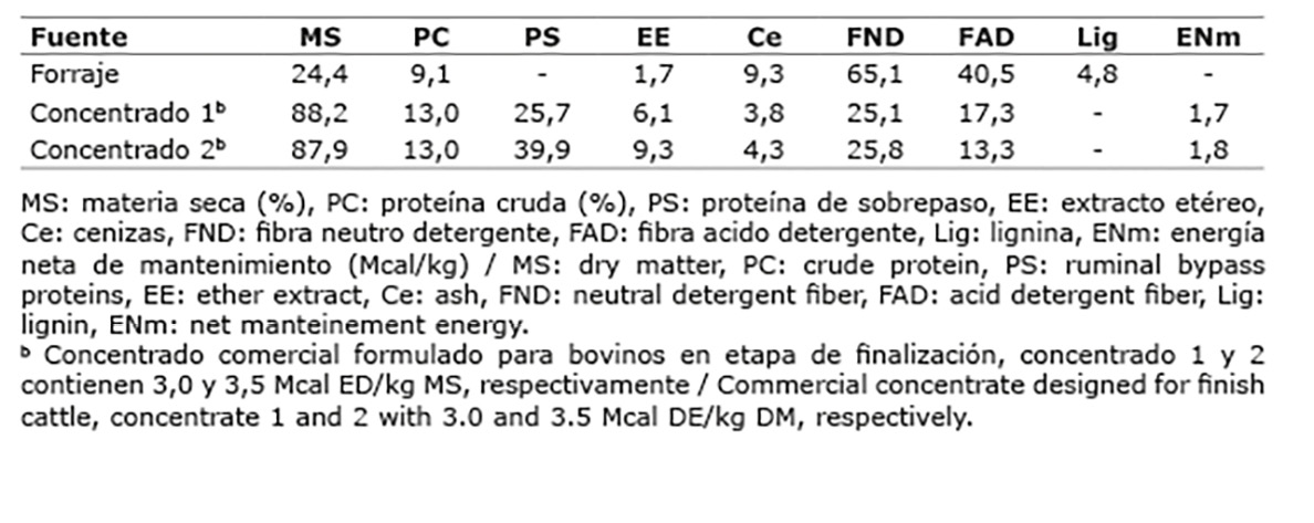 Se utilizaron treinta machos castrados de tres composiciones genotípicas: Bos indicus, Bos taurus y F1 Bos taurus*Bos indicus, cuyas razas predominantes fueron Brahman, Charolais y Brahman*Charolais (F1 Bra*Cha), respectivamente. En todos los casos y según los registros de parentesco y cruzamiento interracial, el porcentaje de genes mínimo de las razas fue de 87,5%. El peso y edad promedio al inicio del experimento fue de 417,9 ± 25,4 kg y 24,1 meses para Brahman, de 421,4 ± 19,5 kg y 25,3 meses para Charolais y de 417,4 ± 26,2 kg y 24,9 meses para F1 Bra*Cha.
