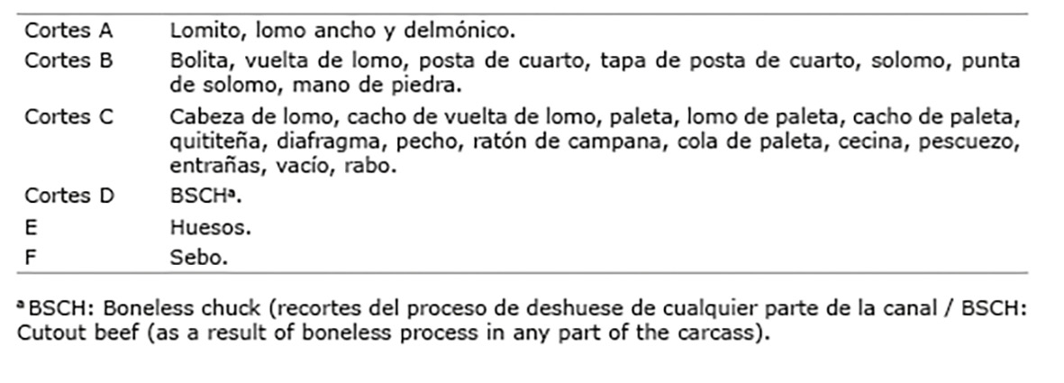 Se realizó un deshuese total, se separó cortes, hueso y sebo de cada una de las medias canales de cada unidad experimental, para determinar el rendimiento cárnico de los cortes según su importancia económica y comercial, con base en el sistema de clasificación de cortes descrito por Holmann et al. (2007) (Cuadro 2). Cada media canal ingresó a la sala de deshuese y fue procesada por los operadores de la planta de cosecha, donde se identificaron debidamente los tipos de corte, se pesaron, empacaron al vacío y numeraron según el diseño experimental. Se cuantificó durante todo el proceso la cantidad de recortes (trozos remanentes producto del deshuese del animal cuyo peso varió entre 30 y 300 g).