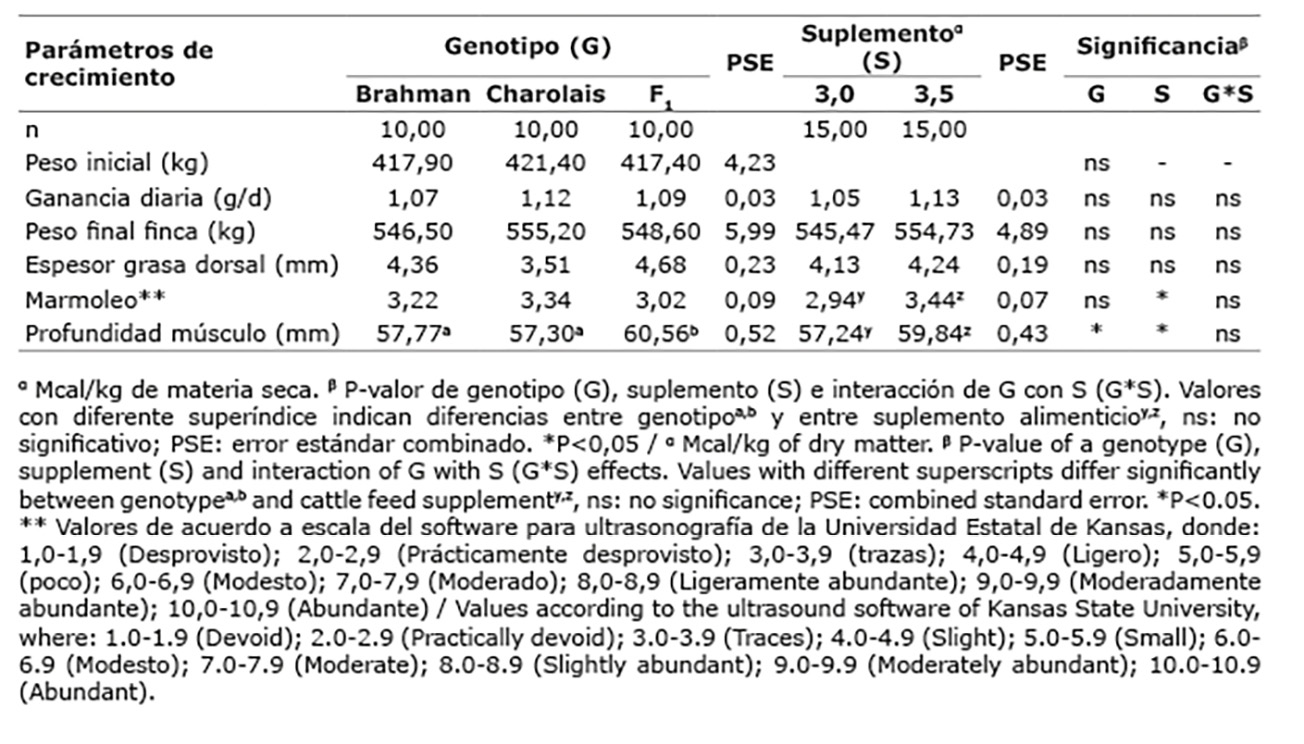 No se encontraron diferencias significativas (P>0,05) en la interacción genotipo*suplemento en las variables de crecimiento y calidad de carne (Cuadro 3). Únicamente se encontraron diferencias (P<0,05) entre suplementos alimenticios para las variables marmoleo y profundidad del músculo, donde la ración más calórica presentó valores mayores para cada variable, y entre genotipos sobre la profundidad de músculo, donde los animales F1 Bra*Cha, fueron superiores a los Brahman y Charolais.