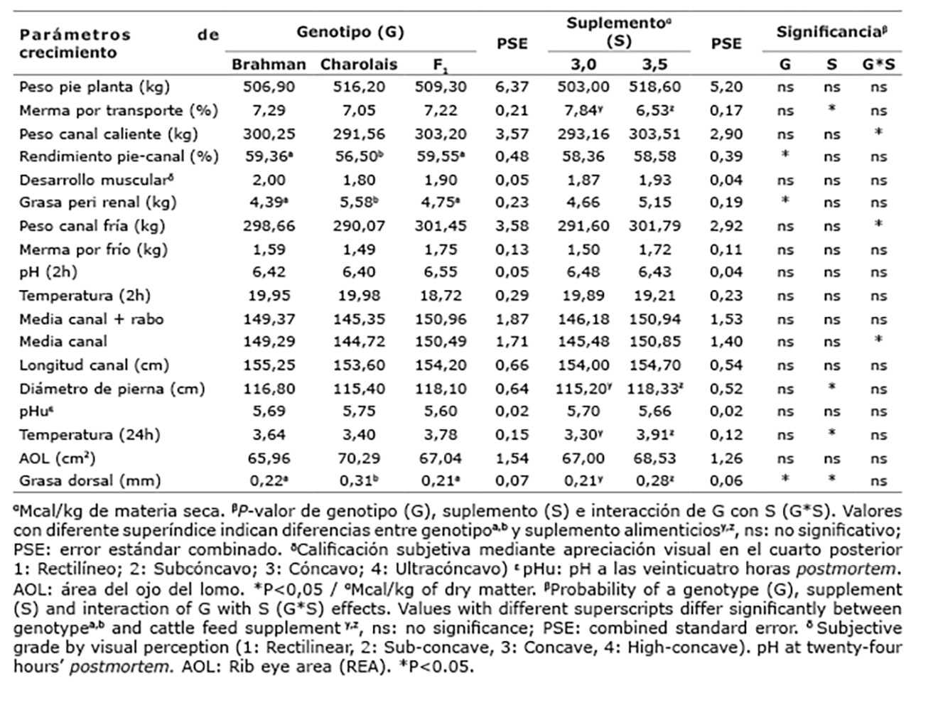 Se encontró un efecto del genotipo y la suplementación (P<0,05) sobre la profundidad del músculo medida in vivo y el grosor de grasa. Hubo efecto del genotipo (P<0,05) sobre el rendimiento de la canal y la grasa perirrenal, y del suplemento (P<0,05) sobre el marmoleo, la merma por transporte, el diámetro de la pierna y la temperatura a las 24 h. En el rendimiento carnicero hubo efecto del genotipo (P<0,05) sobre los cortes lomito, posta de cuarto, punta de solomo, paleta, cacho de paleta y pescuezo. No hubo efecto del genotipo ni de la suplementación (P>0,05)sobre el rendimiento de carne vendible.