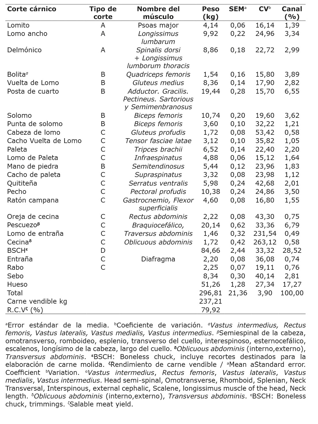 En el Cuadro 5 se presentan los valores promedio con el error estándar de la media (SEM), el coeficiente de variación y el porcentaje que representan de la canal, los cortes cárnicos más comunes en Costa Rica y su categorización según la importancia económica y comercial descrita por Holmann et al. (2007). El rendimiento de carne vendible de la muestra que se obtuvo al suprimir el peso de los huesos, sebo y ligamentos, fue de 79,92 kg (Cuadro 5).