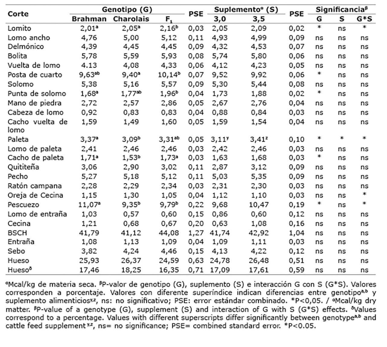 Se evidenció un efecto significativo (P<0,05) de la interacción genotipo*suplemento sobre el corte cárnico lomito; y sobre los cortes paleta, cecina y pescuezo, en donde los animales Brahman suplementados con la dieta más calórica (3,5 Mcal/kg MS) fueron los que presentaron mayores valores en cada una de estas variables (Cuadro 6). Al analizar el efecto del genotipo sobre los tipos de cortes cárnicos, se encontraron diferencias significativas (P<0,05) en los cortes lomo ancho, posta de cuarto, punta de solomo, paleta, cacho de paleta y pescuezo. Para el resto de cortes, así como en la cantidad de sebo y hueso producido, no se encontraron diferencias significativas entre genotipos (P>0,05).