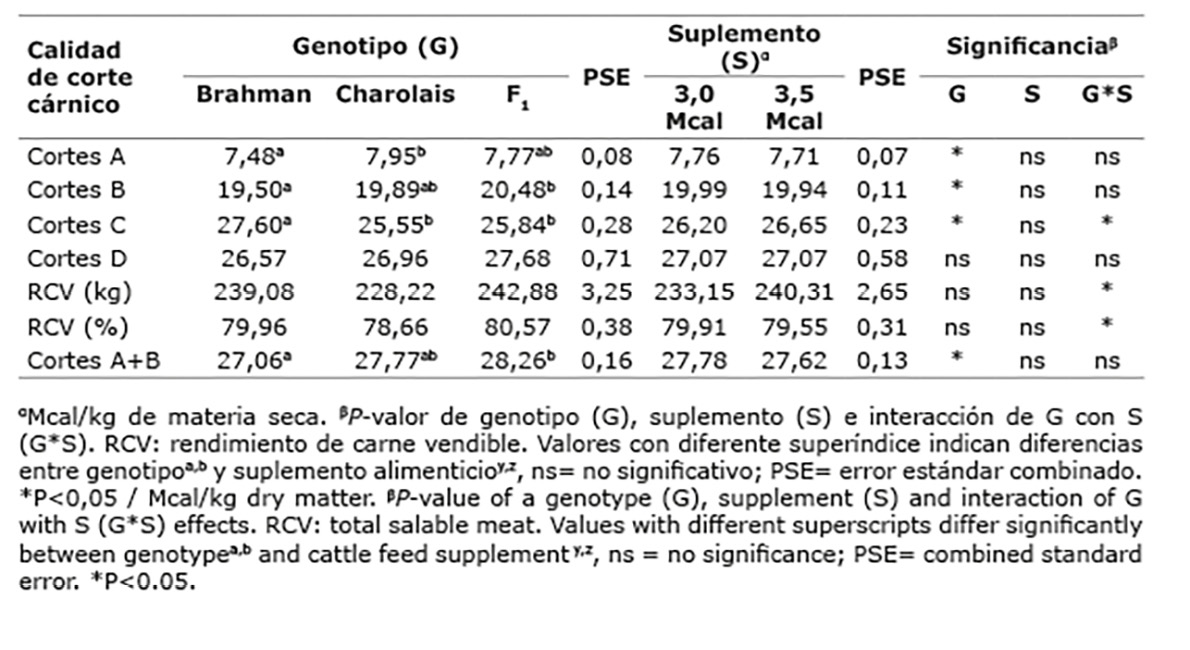 Los resultados obtenidos en este trabajo se podrían explicar debido a que, el peso de cosecha entre los genotipos fue similar, por lo que, el rendimiento de cortes cárnicos de primera, segunda y tercera calidad no varió entre genotipos. Las diferencias en cortes cárnicos como lomito, posta de cuarto y solomo podrían explicarse por los pesos de canal más ligeros (Sethakul et al., 2007), debido a la interacción genotipo * suplemento, donde los animales cebuinos con la suplementación más energética y los F1 Bra*Cha, presentaron un mejor desempeño en el peso de la canal. Resultados similares en el rendimiento del lomito, en animales Nelore han sido reportados por Zorzi et al. (2013).