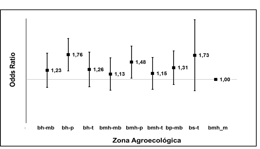 Las zonas en que se presentó mayor propensión a lesiones podales fueron el bosque húmedo premontano (bh-p) y bosque muy húmedo premontano (bmh-p), mientras que la de menor propensión fue el bosque muy húmedo montano (bmh-m, Figura 1). Todas las zonas, excepto bh-p y bmh-p presentaron OR con amplios intervalos de confianza que no difieren significativamente de la zona de referencia (bmh-m).